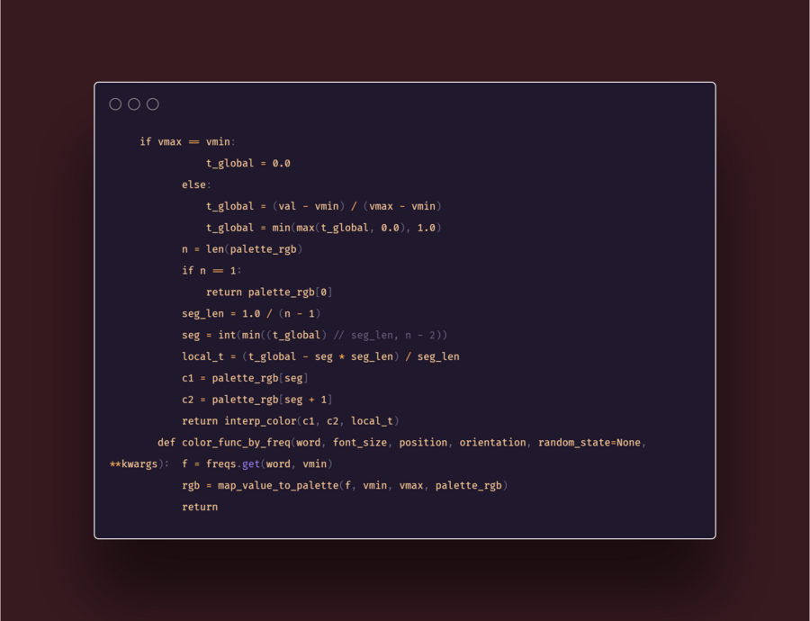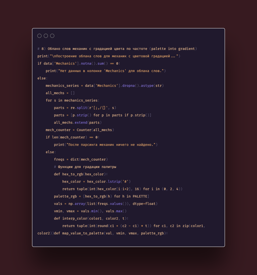 График показывает частоту упоминаний механик; самые популярные механики отображаются крупными словами и более «тёплыми» цветами по градиенту.