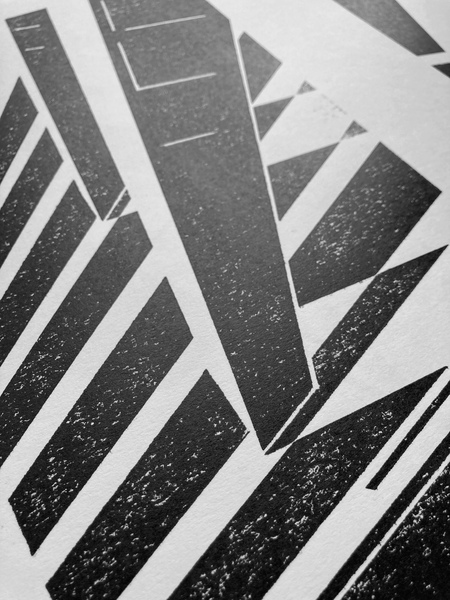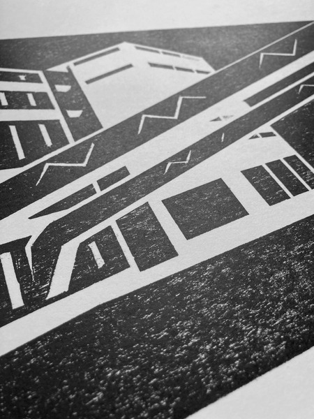 Рассматривая архитектуру завода, я обнаружила интересные геометрические композиции. Многие из них были выразительны благодаря контрформам, образованным разнонаправленными галереями, в которых ранее располагались конвейеры. Я решила создать серию работ с фрагментами здания, используя технику гравюры на картоне. Этот материал позволил получить неоднородный по текстуре оттиск, что усилило индустриальный характер серии.