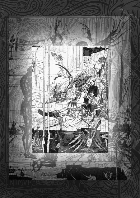 В этом и состоит одна из гениальностей Винсента, погружение сюжетных героев в пространство полной тьмы, которое, в свою очередь, помогает художнику акцентировать внимание главных светлых объёмах. Так, читатель увидит простую по цветам, но очень акцентную, по деталям иллюстрацию. Засчет ч/б быстро улавливается самое главное — суть изображения, т.к не тратится время на распознание полутонов зеленого, желтого и тд.