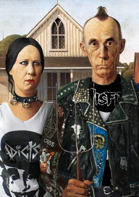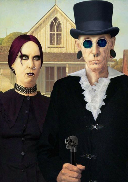 Версии с готами, панками, альтернативными персонажами превращают «Американскую готику» в комментарий о культурных различиях, бунте и идентичности. Строгая фронтальность оригинала контрастирует с подчёркнутой экспрессией субкультурных кодов — пирсингом, чёрной одеждой, макияжем, анархическими символами. Такие вариации показывают столкновение традиционного и маргинального, превращая каноническую семейную пару в метафору о конфликте поколений, норм и девиаций. Это также отражает, как классический образ используется для визуальной самоиронии внутри самих субкультур.