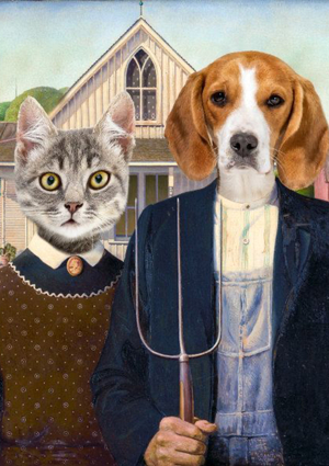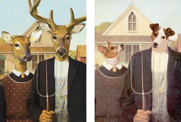 Вариации с животными используют антропоморфизацию как способ подчеркнуть фольклорную, сельскую и мифологическую природу исходного образа. Олени, собаки или коты, полностью «примеряющие» на себя роли фермерской пары, превращают картину в мягкую ироничную карикатуру, где серьезность оригинала соседствует с комизмом человеческих поз, перенесённых на животных. Такие версии высвечивают стереотипы о «простоте» и «натуральности» деревенской Америки, усиливают ощущение притчи или басни и показывают, насколько легко заменить персонажей, не разрушая структуры композиции: даже с животными картина сразу узнаётся.