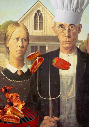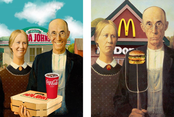 Версии с фастфудом и брендами демонстрируют превращение картины в сатиру на потребительскую культуру. Персонажи, держащие пиццу, колу или бургеры, превращаются в символы глобальной коммерциализации, где «традиционная Америка» обновляется до состояния рекламного клише. Эти пародии подчёркивают, как знаковый образ легко адаптируется под критику капитализма, маркетинга и стандартизированной еды. В них вилы, когда-то символ труда, заменяются едой или остаются как ироничный контраст между трудовой этикой прошлого и удобствами массового потребления настоящего