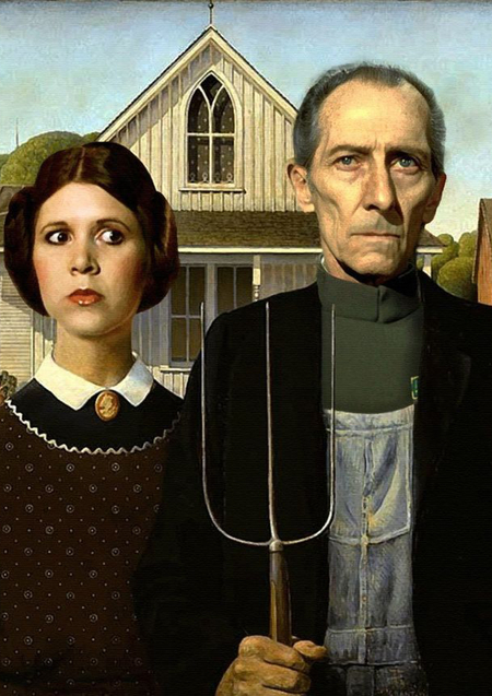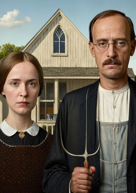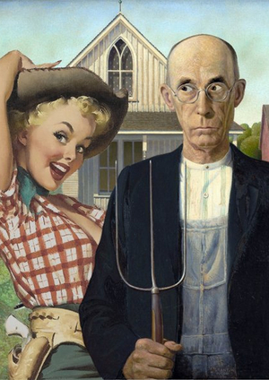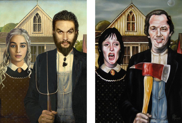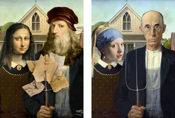 Вариации, где один или оба персонажа заменены на Мону Лизу, Леонардо или героиню пин-ап, превращают картину в метатекст о самой истории искусства. Переплетение стилей и эпох создаёт игру цитат: строгий американский регионализм сталкивается с европейским ренессансом или массовой эстетикой XX века. Такие версии подчеркивают универсальность композиции, показывая, что она может вместить даже самые узнаваемые образы мировой культуры. Это также создаёт эффект культурного «кроссовера», где шедевры разных эпох вступают в ироничный диалог.