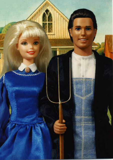 Версии с LEGO-фигурами и Барби обыгрывают тему стандартизации, искусственности и массового производства идентичностей. LEGO-пара превращает героев в прямоугольных, модульных персонажей, подчёркивая механистичность и утрату индивидуальности; Барби и Кен, наоборот, акцентируют сверхидеализированную, глянцевую фальшь современного визуального канона. Эти варианты показывают, как картина переходит в пространство игрушечного и инфантильного, становясь комментарием о том, как культура превращает сложные образы в простые, тиражируемые модели.