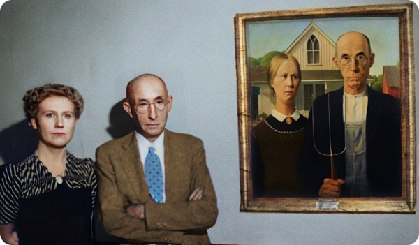 Картина Grant Wood «American Gothic» (1930) возникла после того, как художник, путешествуя по Айове, заметил в городке Элдон дом необычной архитектуры — простой фермерский коттедж с готическим окном, сочетание которого показалось ему идеальной основой для образа «тех людей, которые могли бы здесь жить». В качестве моделей он выбрал своего дантиста Байрона Маккиби и сестру Нэн Вуд Грэхем, одев её в старомодное платье и подчеркнув дистанцию между персонажами, обозначив их как «фермера и его дочь». Вуд работал в стиле регионализма, стремясь показать честность и стойкость людей Среднего Запада, опираясь на опыт изучения европейских старых мастеров. Представленная на выставке в Чикаго, картина получила награду и сразу была куплена Art Institute of Chicago, но вызвала бурную реакцию фермеров, посчитав, изображение насмешкой. Со временем, особенно в эпоху Великой депрессии, она стала трактоваться как символ стойкости и трудовой морали сельской Америки и постепенно превратилась в один из самых узнаваемых культурных кодов США. Простая, почти архетипическая композиция сделала картину чрезвычайно «меметичной»: она постоянно перерождается в пародиях, рекламе, поп-культуре и политической сатире, сохраняя при этом способность отражать тревоги, ценности и самоиронию американского общества.