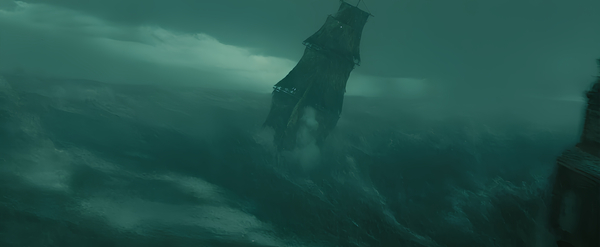 В фильме композиция кадра также центрирована вокруг борьбы двух кораблей, которые окружены морским водоворотом. Визуально это создает впечатление кругового движения и затягивания в центр конфликта, подчеркивая драматизм и напряженность момента.