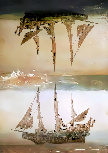 В своей работе, художник использует мягкие, размытые цвета, чтобы создать эффект туманности и неопределенности. В данной картине преобладают пастельные оттенки серого, синего и бежевого, которые смешиваются, создавая ощущение воздушности и легкости. Эти цвета способствуют созданию чувства спокойствия и одиночества. Корабль окружен простором открытой воды и неба, что усиливает ощущение уединения и изоляции. Горизонт затуманен, что добавляет загадочности и усиливает впечатление неизбежности и беспомощности ситуации.