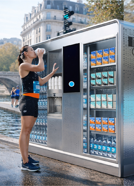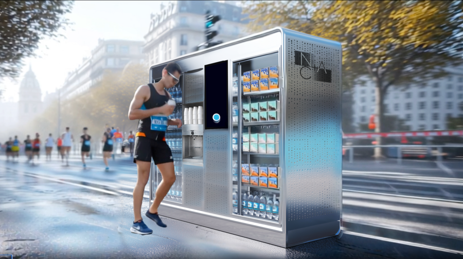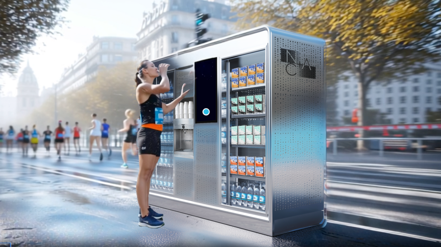 Одна сторона конструкции совмещает вендинговый аппарат для покупки товаров бренда и кулер с водой производства NA+CA, а также планшет, через который человек может купить товар или протестировать бесплатно датчик, добавившись в сообщество бренда через QR