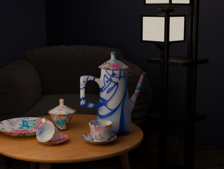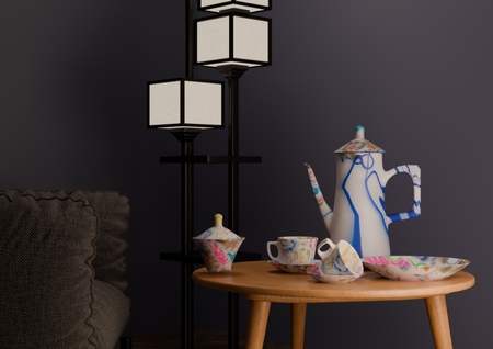 Набор посуды стилистически напоминает советские сервизы (цветочные паттерны и узоры), но при этом совмещает в себе и американскую эстетику (вандализм и граффити).