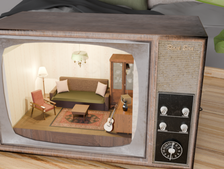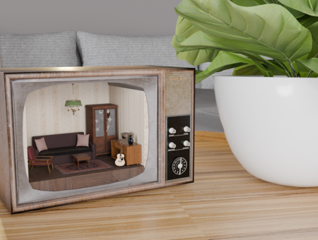 Мини-инсталяция / румбокс советской комнаты в форме старого телевизора, объект напоминает о доме, который эмигранты обустраивали в своем новом пространстве.