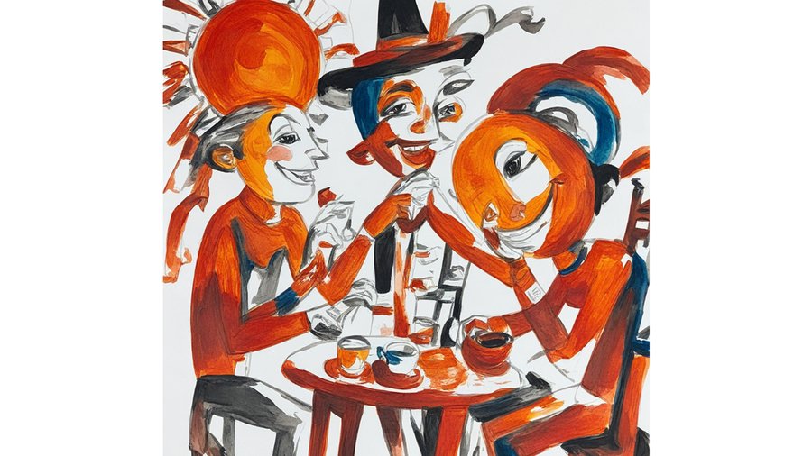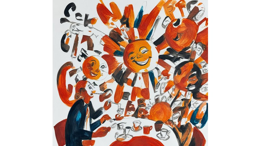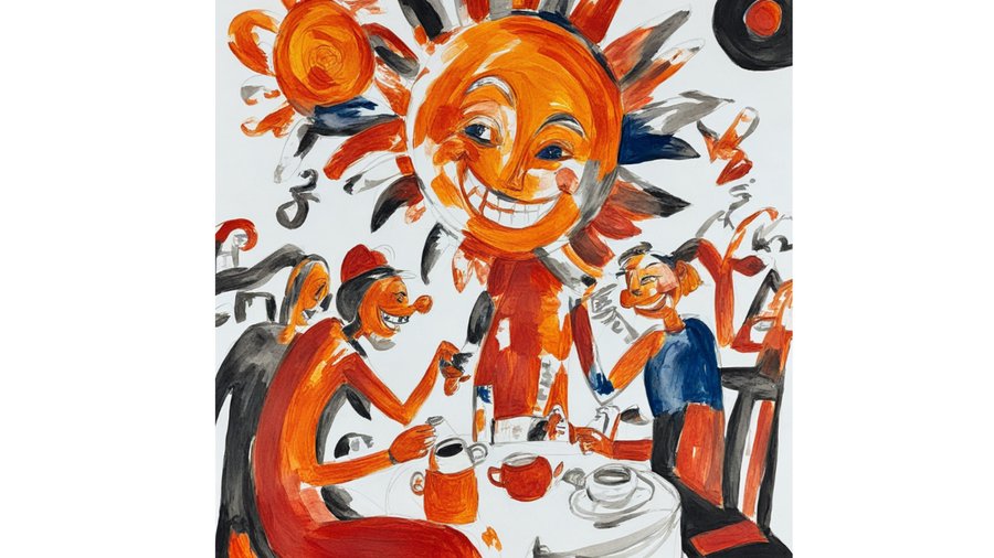 Промпт:"A cheerful anthropomorphic sun character and a lyrical poet character sitting together at a table, drinking tea, smiling and interacting, full-body, cartoon style, vibrant colors, whimsical and friendly atmosphere, expressive faces, white background, highly detailed, cozy and joyful scene»