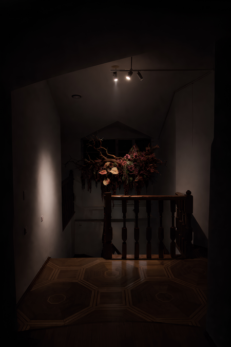 Атмосфера события строится на трех ключевых элементах, которые материализуют концепцию «первородного гнева»: приглушенный свет, создающий камерность и погружение, фактурные шторы служат, нарочито «неидеальная», дикая флористика.