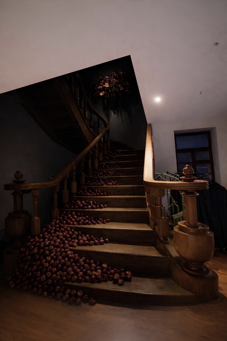 Из пространства внешнего хаоса гости попадают в зону телесного гнева. Здесь царит тишина, которую нарушает лишь размеренный стук капель воды — символ непрерывного цикла и накопления. Каждая капля представляет собой новый импульс, постепенно ведущий к внутреннему переполнению. Атмосфера раскрывает гнев как процесс, направленный вовнутрь, — переживание, сконцентрированное в теле, вынужденном нести тяжесть последствий. Работы в пространстве визуализируют это состояние медленного вызревания чувства, лишённого внешнего выхода.