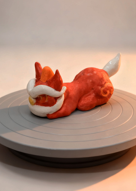 Эта работа посвящена китайскому мифическому существу Писяо, символу защиты, отвращения зла и привлечения богатства. Скульптура выполнена в лежащей позе, выражающей устойчивость и силу. В цветовой гамме использованы четыре глазури — красная, белая, жёлтая и оранжевая: красный олицетворяет страсть и энергию, белый — чистоту и равновесие, жёлтый символизирует тепло и достаток, а оранжевый добавляет живость и динамику. Сочетание и переливы этих цветов создают образ, в котором сочетаются таинственность и доброжелательность Писяо.