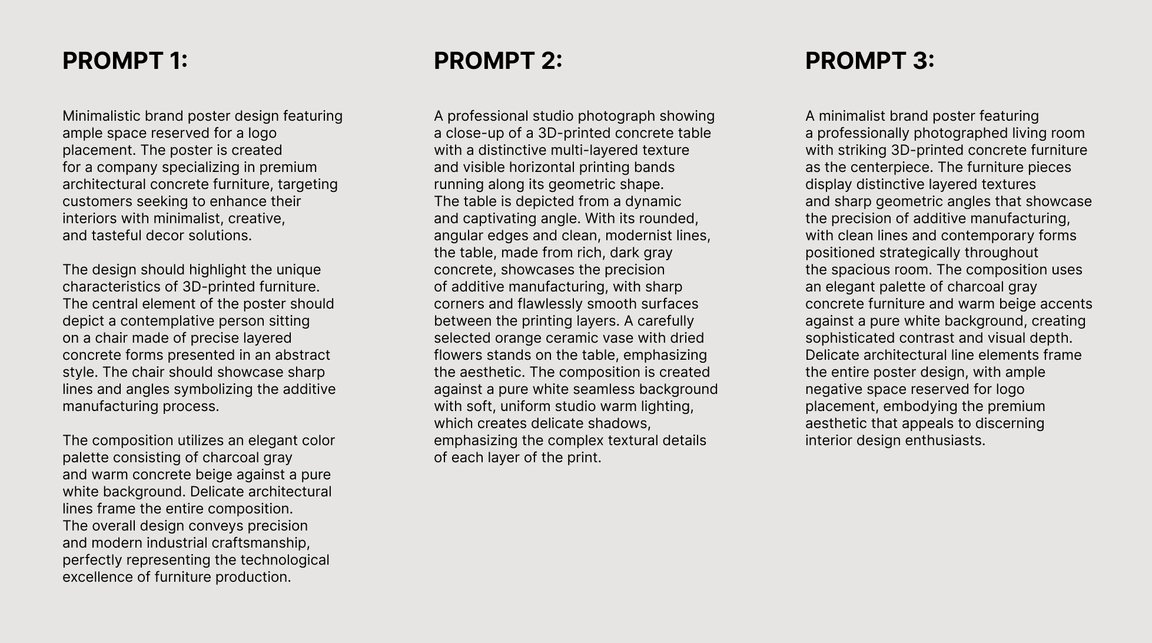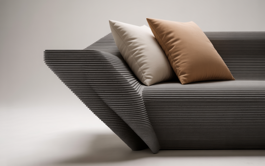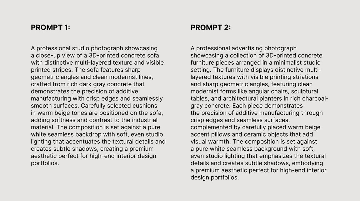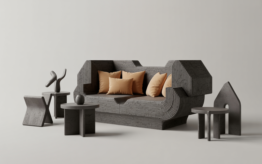 Prompt: A professional advertising photograph showcasing a collection of 3D-printed concrete furniture pieces arranged in a minimalist studio setting. The furniture displays distinctive multi-layered textures with visible printing striations and sharp geometric angles, featuring clean modernist forms like angular chairs, sculptural tables, and architectural planters in rich charcoal-gray concrete. Each piece demonstrates the precision of additive manufacturing through crisp edges and seamless surfaces, complemented by carefully placed warm beige accent pillows and ceramic objects that add visual warmth. The composition is set against a pure white seamless background with soft, even studio lighting that emphasizes the textural details and creates subtle shadows, embodying a premium aesthetic perfect for high-end interior design portfolios.