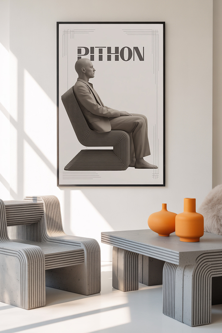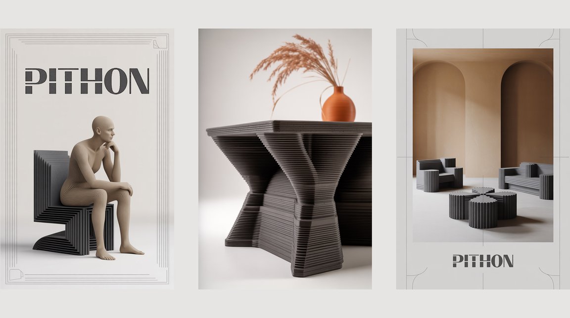 Prompt: A minimalistic company logo design featuring the text «PITHON» in bold, clean sans-serif lettering with subtle concrete texture effects applied to the letterforms. Below the company name, a sleek geometric representation of a 3D printer nozzle is shown creating layered concrete forms in an abstract stack, symbolizing the additive manufacturing process with clean lines and precise angles. The logo incorporates a sophisticated muted color palette of charcoal gray and warm concrete beige against a crisp white background. Thin architectural line elements frame the composition, suggesting precision and modern industrial craftsmanship in technological furniture production.