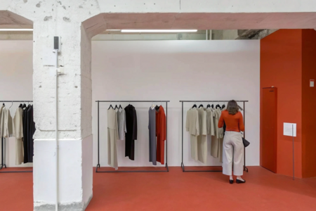 An interior of an archival second-hand boutique. Brutalist concrete walls with visible texture, minimal industrial design. Simple black metal clothing racks with curated neutral-toned garments — black, white, gray, beige — neatly arranged. Soft diffused lighting creates a calm, curated atmosphere. A few stylish people are browsing and selecting clothes, dressed in understated contemporary outfits. Vintage speakers or audio equipment as subtle decor elements. Spacious concrete floor, clean layout, neutral palette with small red accents in signage or details. The overall mood is refined, modern, and archival — blending vintage and minimalist aesthetics.