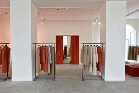 An interior of an archival second-hand boutique. Minimal and curated space with soft natural daylight, neutral tones, and a clean layout. Light beige or off-white walls, polished concrete or light wood flooring. Simple black metal clothing racks displaying a curated selection of neutral and earthy garments — beige, brown, gray, cream. A fitting room area is visible — minimalist design with a curtain or partition, softly lit and cohesive with the store’s aesthetic. Black leather boots and vintage accessories displayed neatly on an industrial-style metal platform. Subtle red accents appear in signage, small decor, or details.