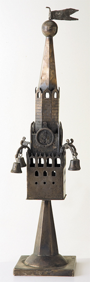 Бсамим (сосуд для субботних благовоний) в форме башни. Польша, конец ХIХ века. (слева) Синагогальный подсвечник со львами. Польша — Литва, вторая половина ХIХ века. Бронза, литье, гравировка. (справа)