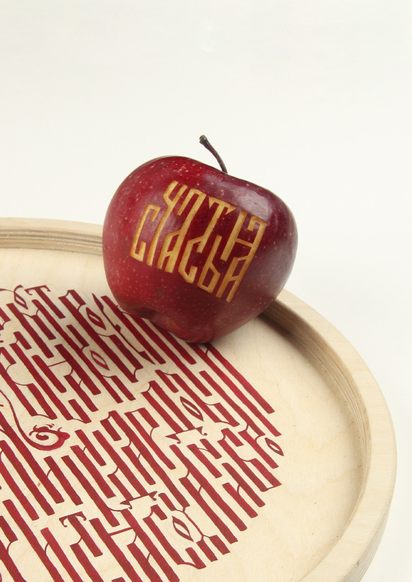 Проект выполнен русской вязью и обращается к образу дома как сакрального пространства и высшей ценности. Три яблока с вырезанными словами «любви», «мира» и «счастья» продолжают текст в материале, превращая пожелание в дар, который можно принять, разделить и сохранить.