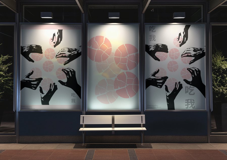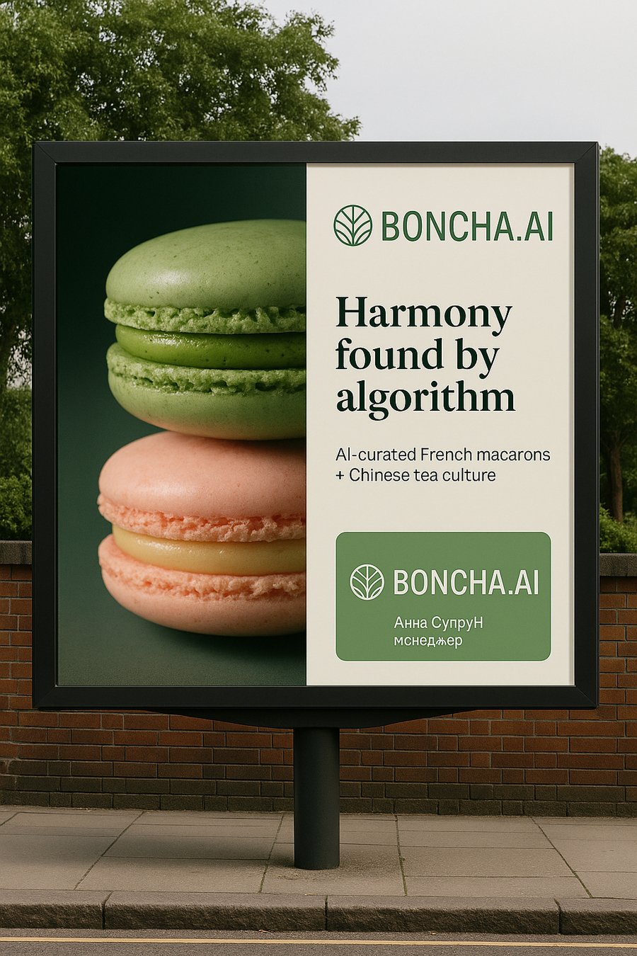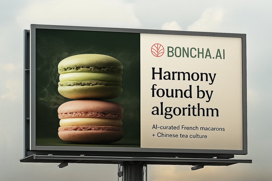 chat gpt: Billboard for BONCHA.AI. Left: striking macro of matcha & jasmine macarons. Right: headline ‘Harmony found by algorithm’. Sub-line: ‘AI-curated French macarons + Chinese tea culture’. Large clean logo, high contrast legibility from distance, lots of negative space