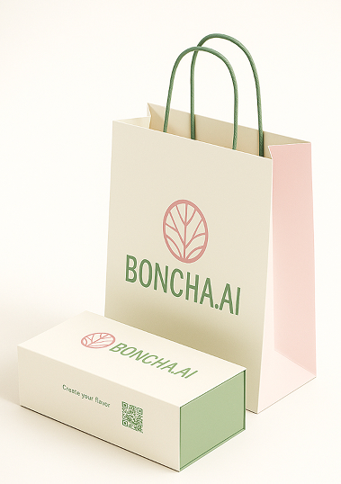 Premium macaron box and paper bag set for BONCHA.AI. Matte ivory base FAF8F6, accents in matcha green A2C48D and sakura pink #F9C5D1. Front label with BONCHA.AI logo, subtle AI-inspired vein pattern, QR code ‘Create your flavor’. Clean studio lighting, isometric angle, high-res packaging mockup.