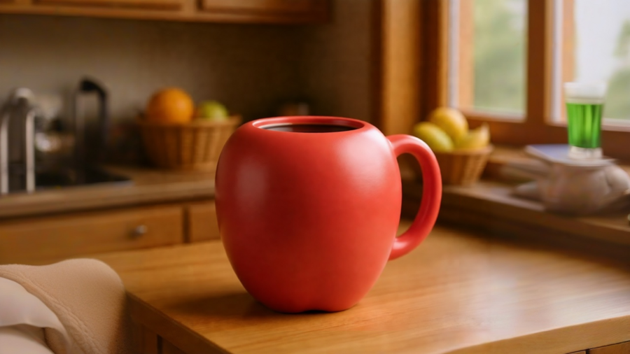 A 3D printable mug shaped like an apple. Smooth rounded apple-like body, slightly flattened vertically, clean organic silhouette. Clearly visible circular opening on the top, hollow interior for liquid, uniform rim thickness. Flat stable bottom. Simple standard mug handle, identical across a product series, oval closed loop, neutral shape, attached on the side. Stylized apple form, simplified geometry, no stem, no leaves, no decorative elements. Mostly smooth surface with subtle organic curvature. Solid opaque material appearance, matte surface. Red or red-green apple color. Neutral background, object centered. Design suitable for FDM 3D printing: thick walls, no thin details, no sharp edges.