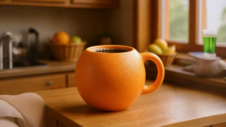 A 3D printable mug shaped like an orange. Nearly spherical body with subtle surface texture suggesting citrus peel. Clearly visible circular opening on the top, hollow interior for liquid, uniform rim thickness. Flat stable bottom. Simple standard mug handle, identical across a product series, oval closed loop, neutral shape, attached on the side. Stylized orange form, simplified geometry. Lightly textured surface, not detailed. Solid opaque material appearance, matte surface. Orange color. Neutral background, object centered. Design suitable for FDM 3D printing: thick walls, no thin details, no sharp edges.
