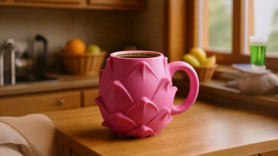 A 3D printable mug shaped like a dragon fruit (pitaya). Rounded oval body with simplified petal-like protrusions flowing upward along the surface. Clearly visible opening on the top, hollow interior for liquid, uniform rim thickness. Flat stable bottom. Simple standard mug handle, identical across a product series, oval closed loop, neutral shape, attached on the side. Stylized dragon fruit form, simplified geometry, moderate surface detail. Smooth surface with soft raised elements, no sharp points. Solid opaque material appearance, matte surface. Pink dragon fruit color. Neutral background, object centered. Design suitable for FDM 3D printing: thick walls, no thin details, no sharp edges.