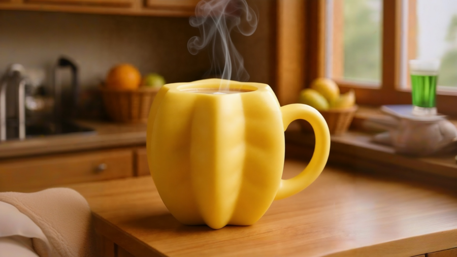 A 3D printable mug shaped like a starfruit (carambola). Rounded body with softly defined star-shaped ridges, symmetrical and evenly spaced. Clearly visible circular opening on the top, hollow interior for liquid, uniform rim thickness. Flat stable bottom. Simple standard mug handle, identical across a product series, oval closed loop, neutral shape, attached on the side. Stylized starfruit form, simplified and rounded geometry, no sharp ridges. Smooth surface with gentle transitions between ridges. Solid opaque material appearance, matte surface. Yellow starfruit color. Neutral background, object centered. Design suitable for FDM 3D printing: softened geometry, thick walls, no thin details.