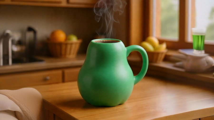 Промпт: Make this image look like a promotional poster. The background should be a cozy kitchen with a fruit basket behind the main mug. Add some drink in the mug.