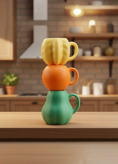 Промпт: Make this image look like a promotional poster. The background should include a cozy kitchen with a fruit basket behind the main mugs.
