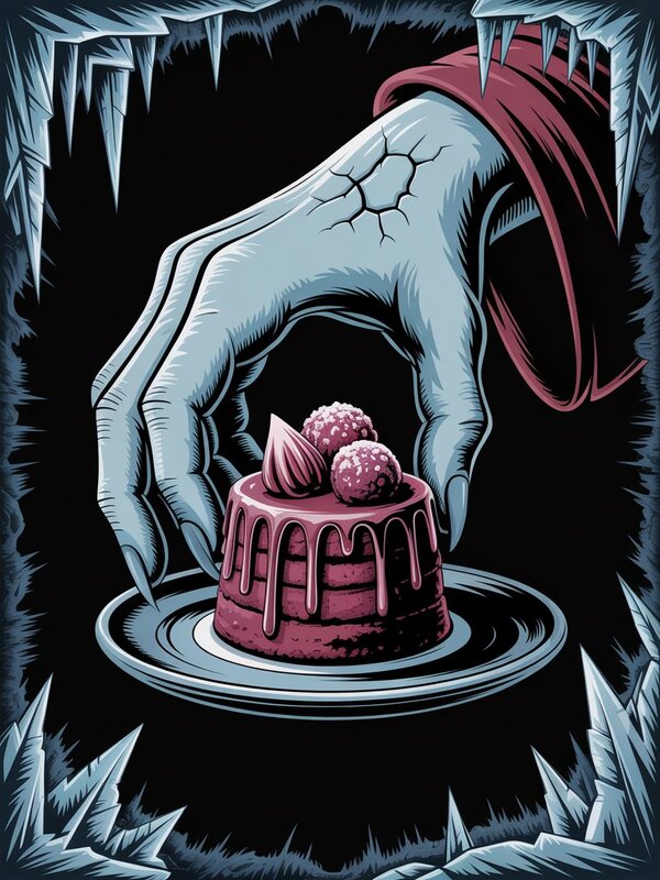 Промпт: Create a striking poster featuring a gothic vampire hand, elongated and sinister, holding a decadent dessert. The scene should evoke a chilling, supernatural atmosphere with icy and gothic elements. The vampire hand should be detailed with textured, cracked ice-like skin, emphasizing frost and coldness, with accents in deep burgundy and icy blue tones. The dessert in the hand could be a blood-red velvet cake, garnished with frost-like icing or crystalline sugar, adding to the icy aesthetic. Incorporate a dark, moody background with gothic motifs and textures resembling ice shards and frost patterns. Use dramatic lighting to highlight the frost textures and the vampire hand, creating a mysterious and alluring visual that captures the wintry, vampire, gothic vibe of the café. The overall composition should be visually intense, dark, and captivating, perfect for promoting the café’s unique ambiance.