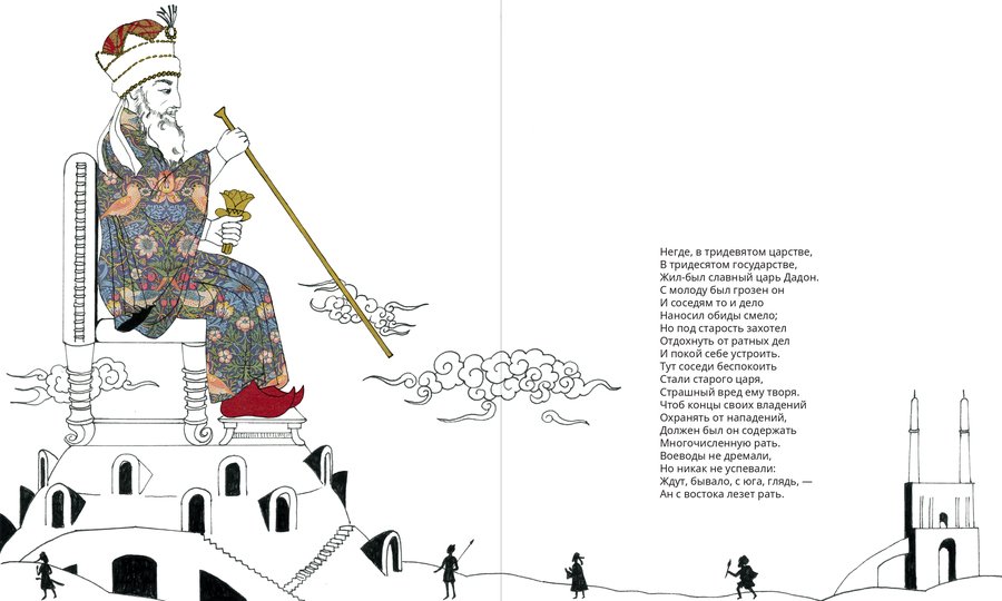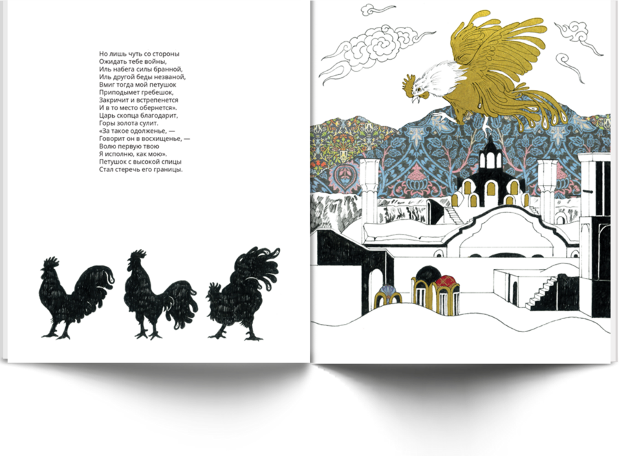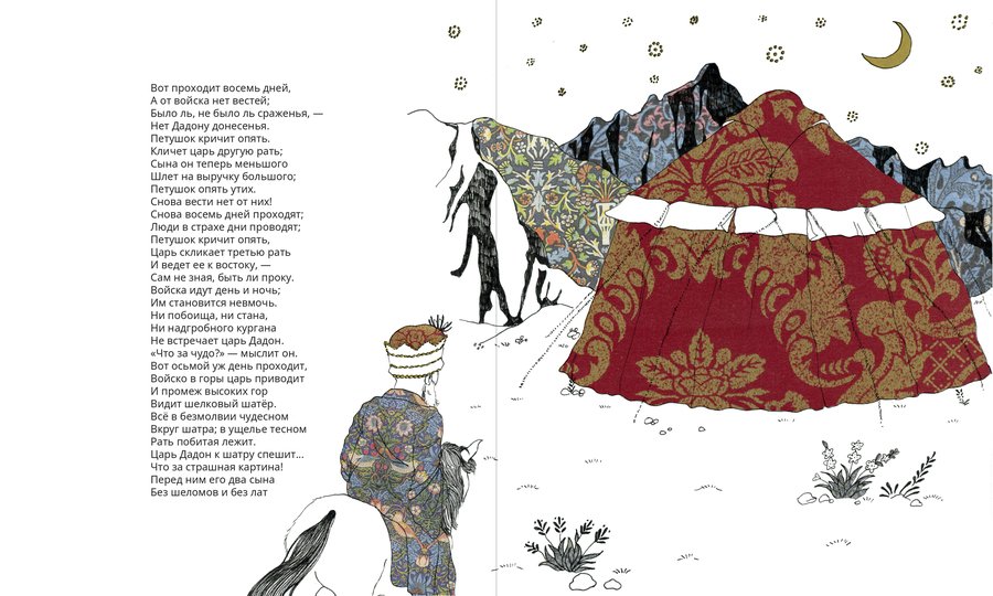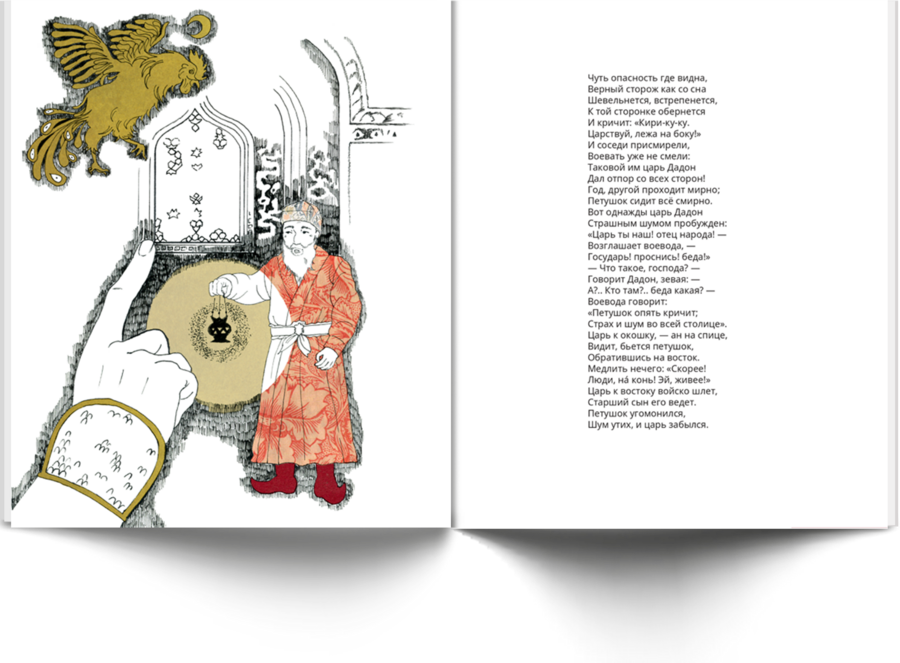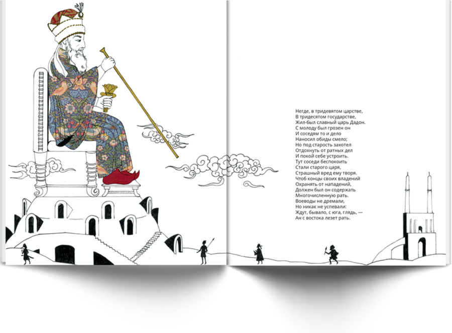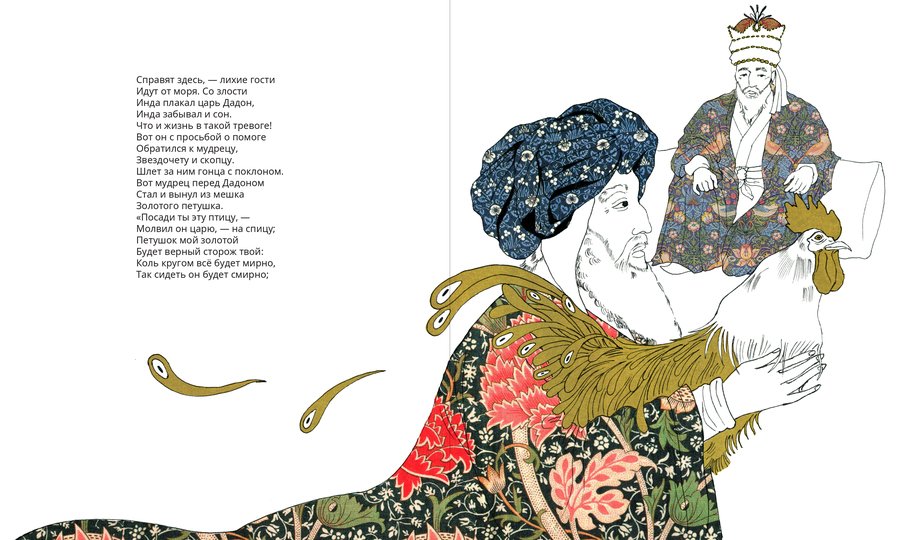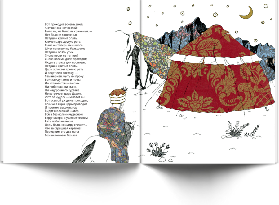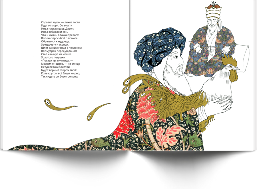 Иллюстрация для оформления книги А. С. Пушкина «Сказка о золотом петушке» выполнена по мотивам персидской миниатюры.