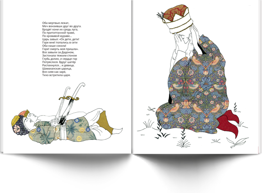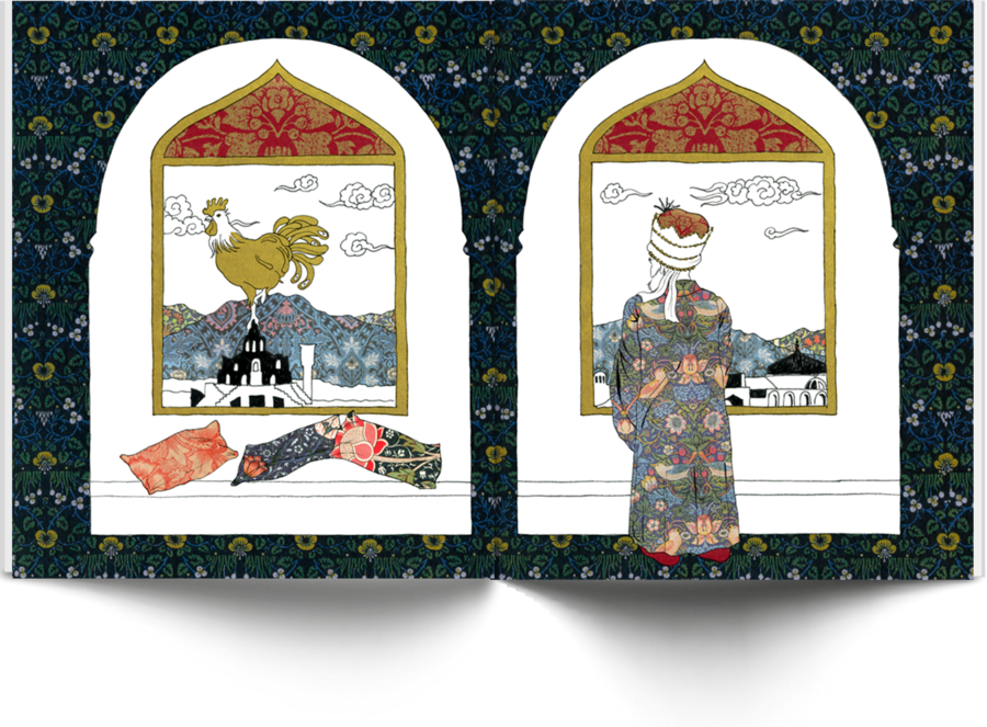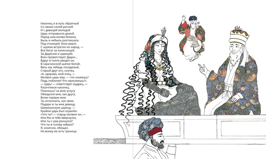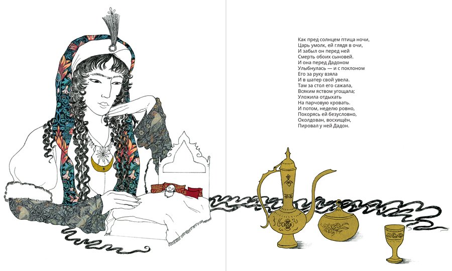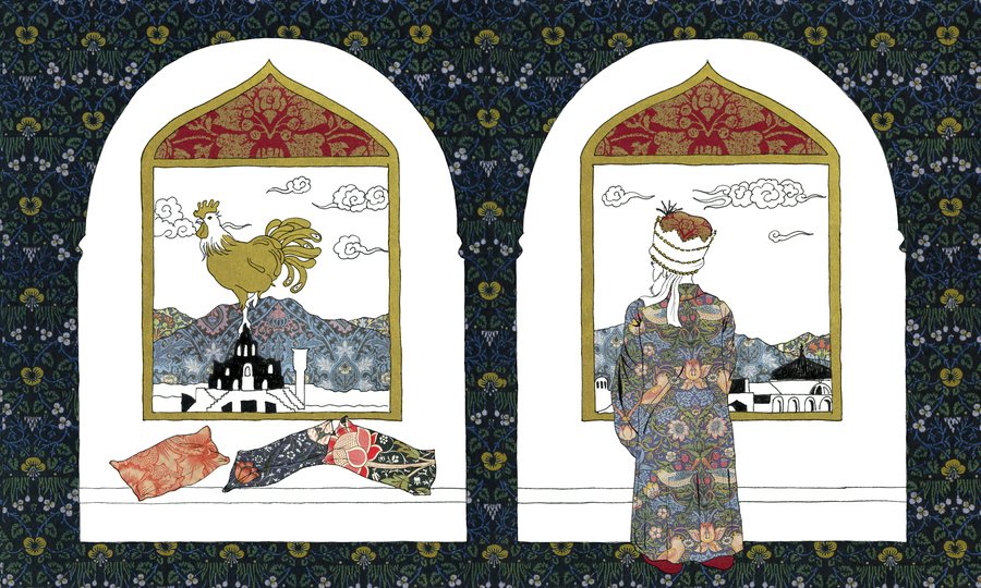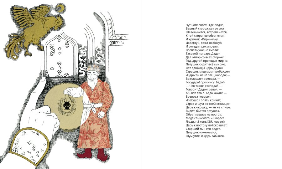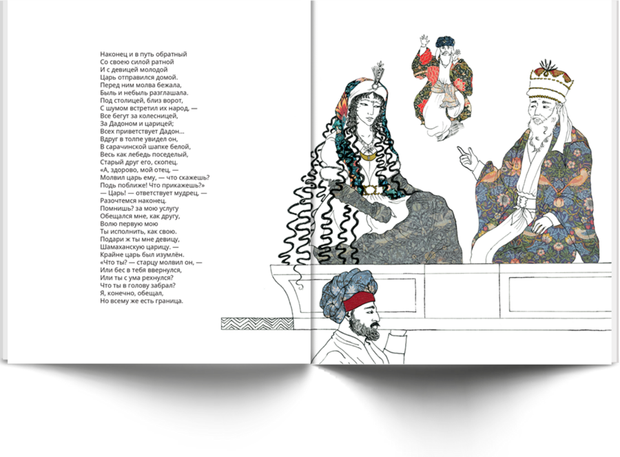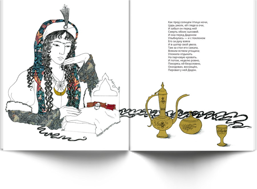 Иллюстрация для оформления книги А. С. Пушкина «Сказка о золотом петушке» выполнена по мотивам персидской миниатюры.