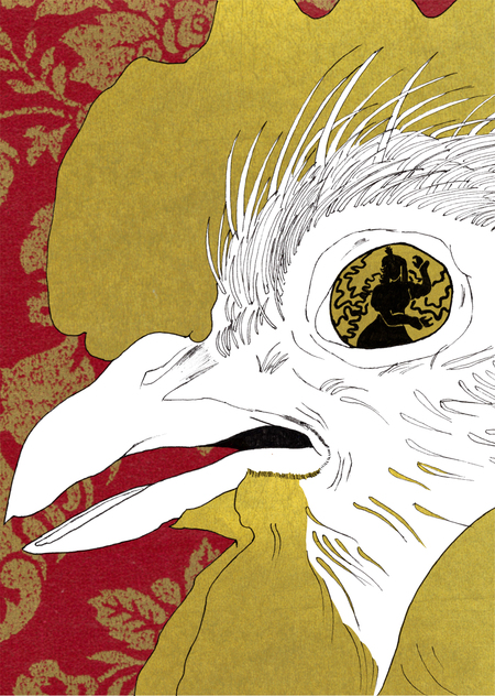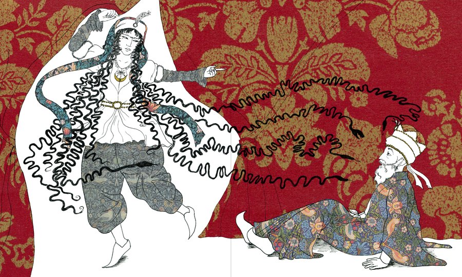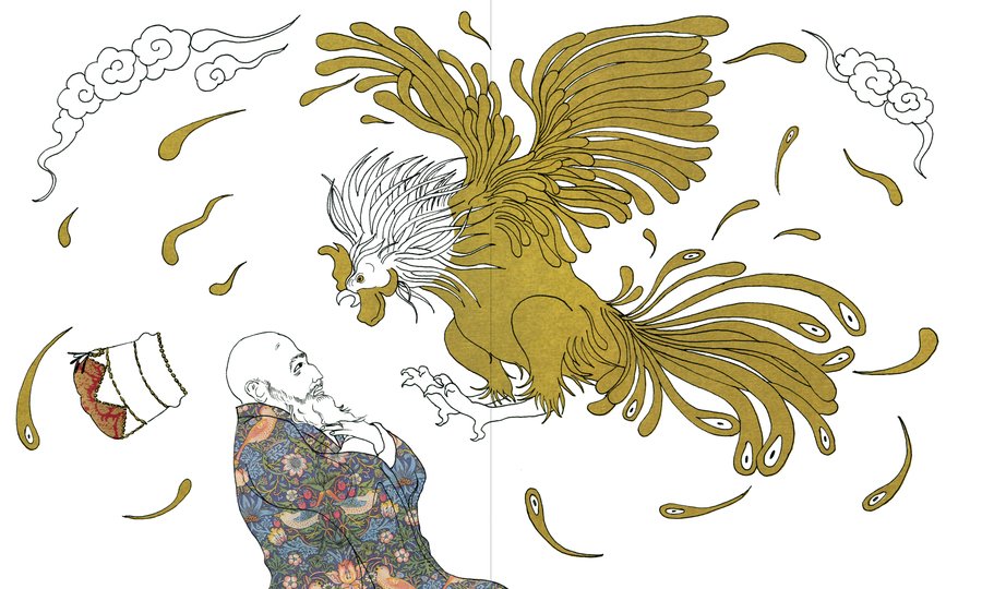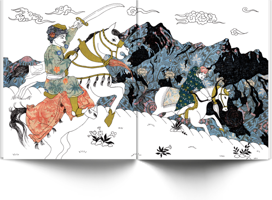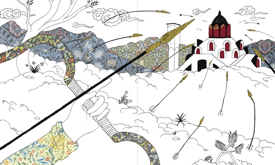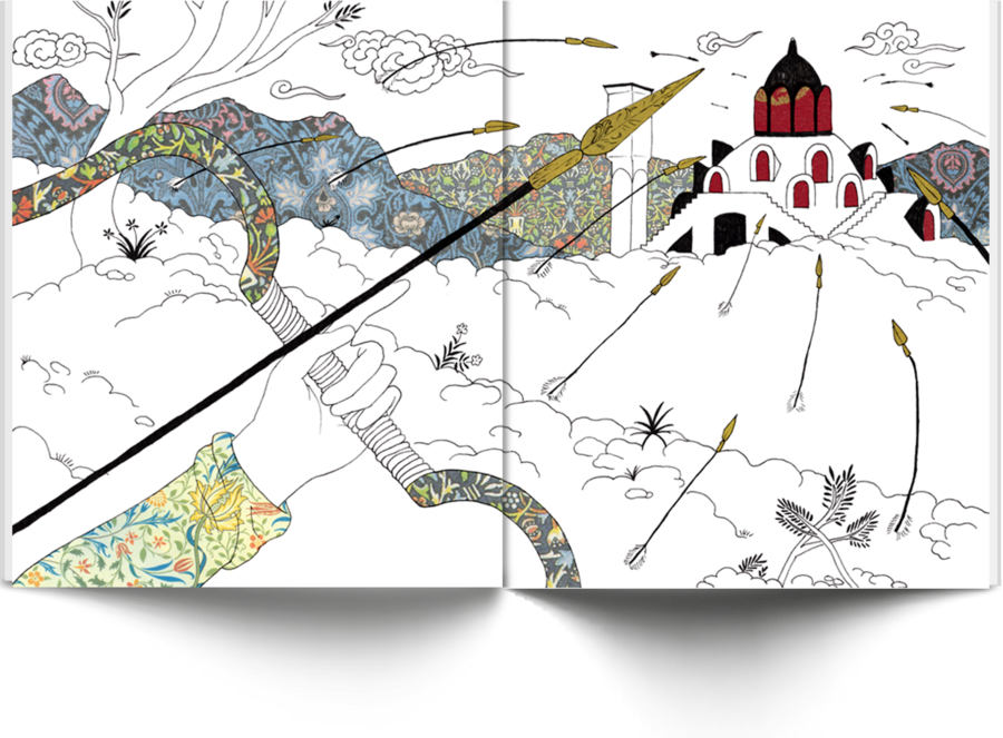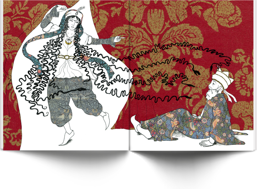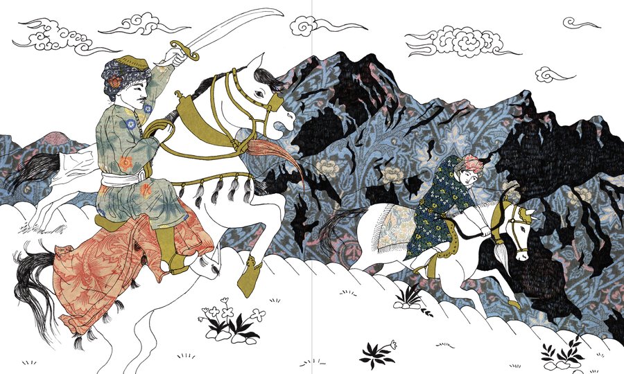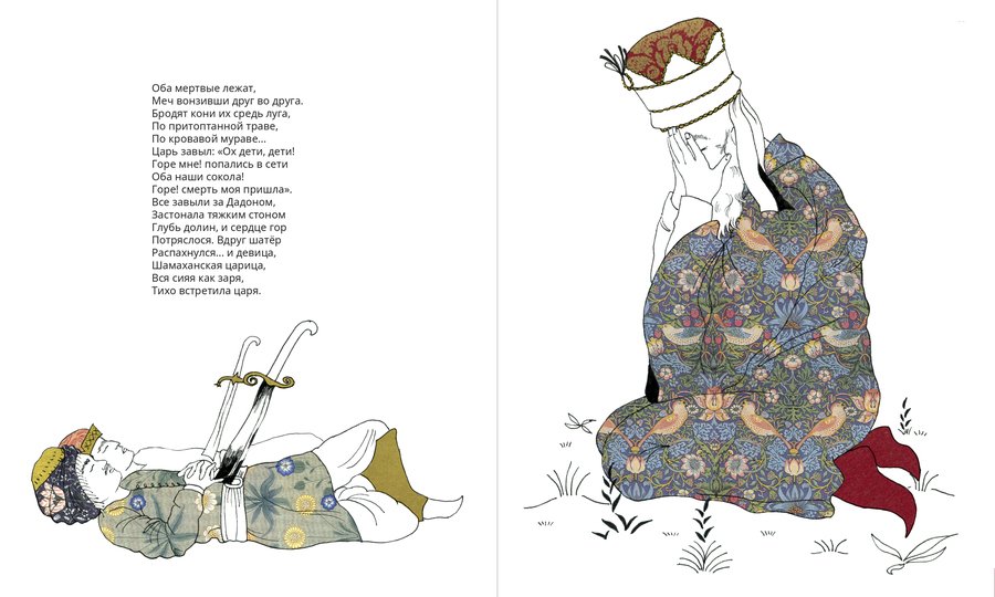 Иллюстрация для оформления книги А. С. Пушкина «Сказка о золотом петушке» выполнена по мотивам персидской миниатюры.