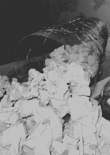 Проект исследует точку застоя в творческом цикле «рождение идеи — критика — отбор — реализация». У нас этот цикл замкнулся на первых трех этапах, превратившись в бесконечную петлю. Ведро с бумагами — это накопитель потенциальных идей, которые так и не получилось осуществить. Наш объект фиксирует акт отказа, а в видео отображен процесс работы с объектом.