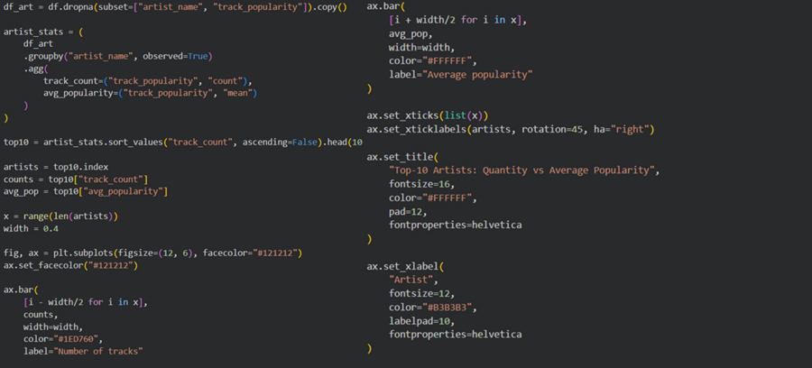 Выводы: Количество треков ≠ средняя популярность. Видно, что артисты с наибольшим числом треков (например, Тэйлор Свифт) не обязательно имеют самую высокую среднюю популярность. Высокая средняя популярность возможна при умеренном объёме. Дрэйк, Лана дель Рей и Ариана Гранде показывают высокую среднюю популярность при сравнительно меньшем количестве треков. Это указывает на более стабильный «уровень» релизов. Также тут нет линейной зависимости.Если бы «больше треков = выше популярность», столбцы росли бы синхронно, но этого не наблюдается. Зависимость слабая и явно не монотонная.
