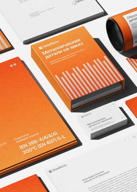 В основу графического образа легла ребристая поверхность деталей. Оранжевый градиент подчеркивает уникальность продукции, а строгая композиция отсылает к точности и аккуратности