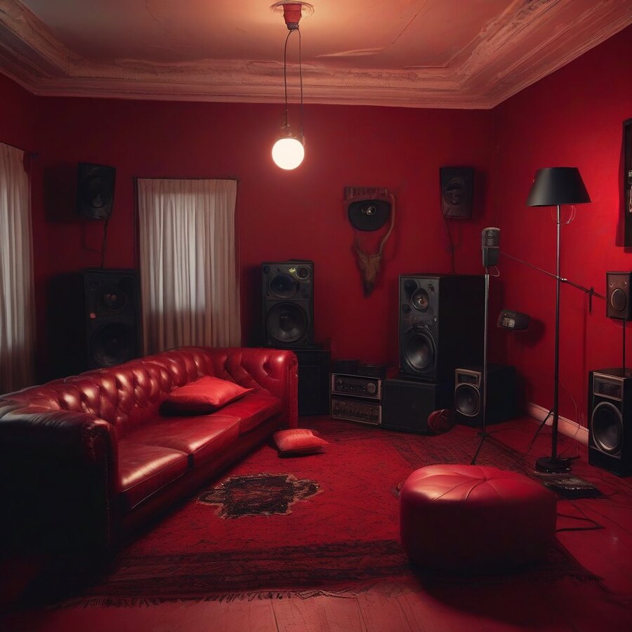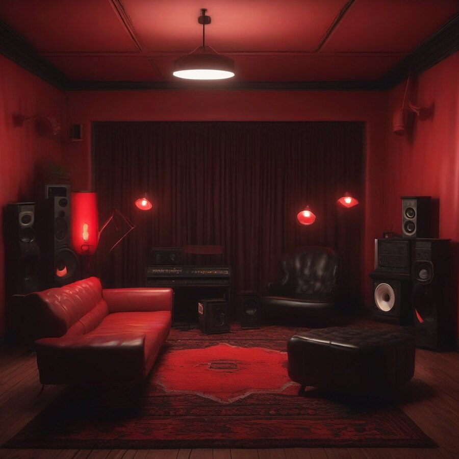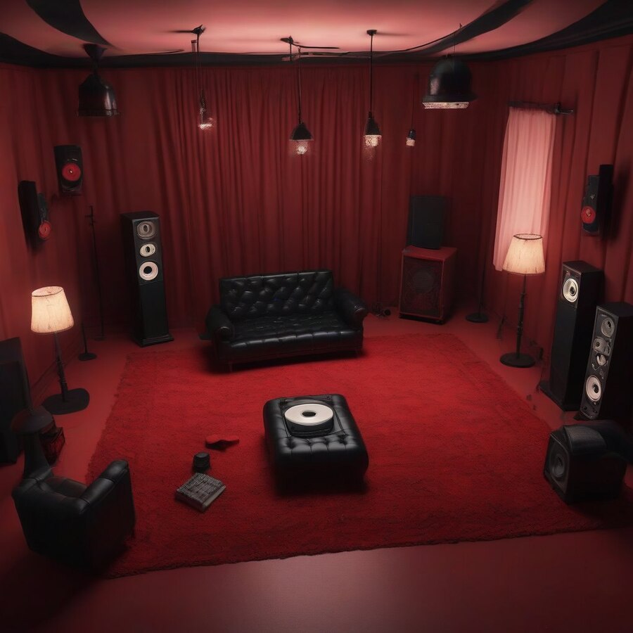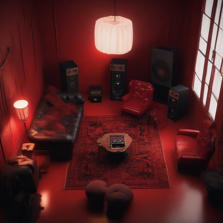 1. A mockup of a small, cozy, dark room for listening to music, in the style of David Lynch’s «Red Room,» featuring rugs, floor lamps, a large black leather sofa, and a sound system, subdued, soft lighting, top view, soft color scheme.