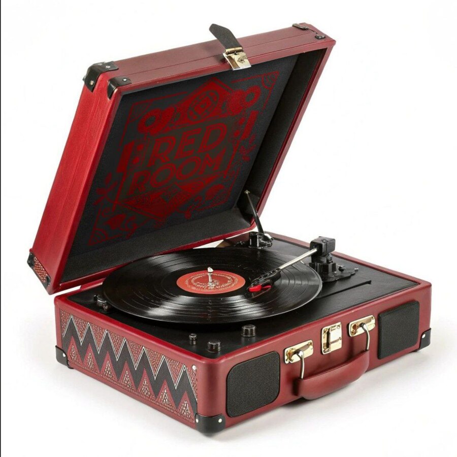 1. A mockup of high-quality vintage vinyl record player for listening to music, red accents in the design, leather elements in the design, in the style of David Lynch’s Twin Peaks, a clean white background, photo for advertising 2. A mockup of high-quality studio headphones for listening to music, red accents in the design, leather elements in the design, in the style of David Lynch’s Twin Peaks, a clean white background, photo for advertising 3. A mockup of high-quality synth, red accents in the design, leather elements in the design, in the style of David Lynch’s Twin Peaks, a clean white background, photo for advertising 4. A mockup of high-quality bass guitar, red accents in the design, leather elements in the design, in the style of David Lynch’s Twin Peaks, a clean white background, photo for advertising 5. A mockup of high-quality stereo system for listening to music, red accents in the design, leather elements in the design, in the style of David Lynch’s Twin Peaks, a clean white background, photo for advertising 6. A mockup of high-quality gift box, red accents in the design, in the style of David Lynch’s Twin Peaks, a clean white background, photo for advertising 7. A set of metal pins inspired by David Lynch’s Red Room, musical elements in the design.