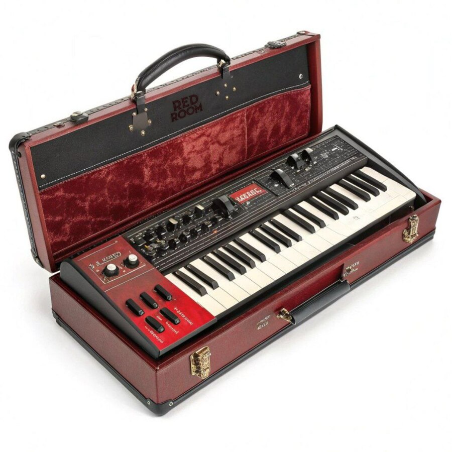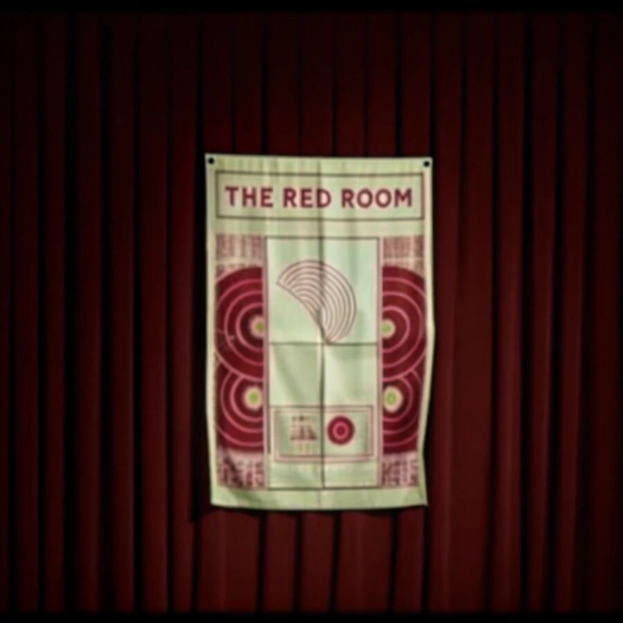 1. Interesting surreal poster for a music listening studio called The Red Room, vintage, red tones, with elements of music in design, mockup on a red curtain background