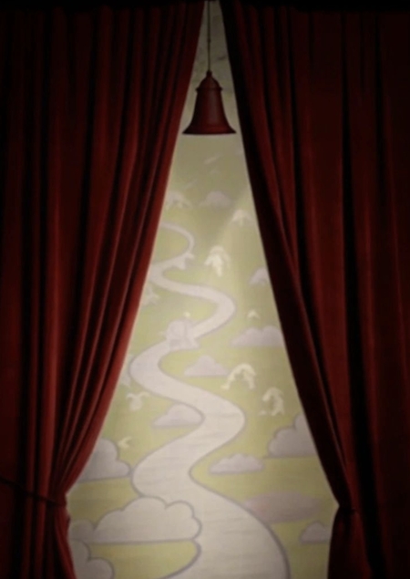1. Open red curtains, behind them a path to a wonderful and surreal world of dreams, bells hanging from the above