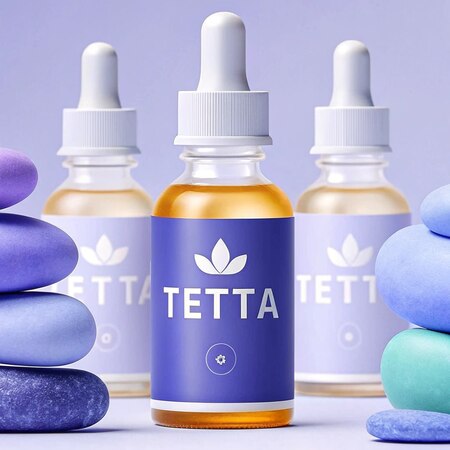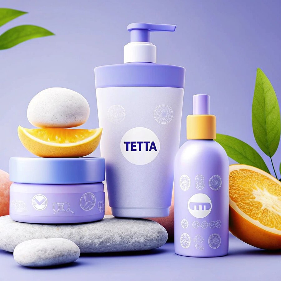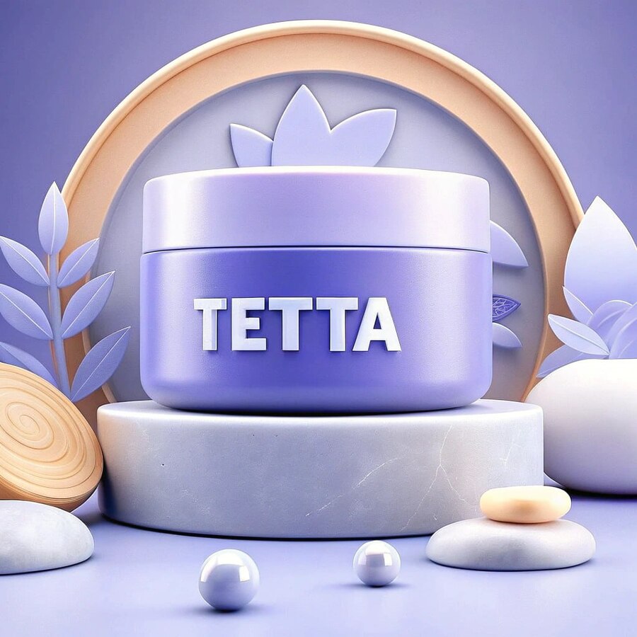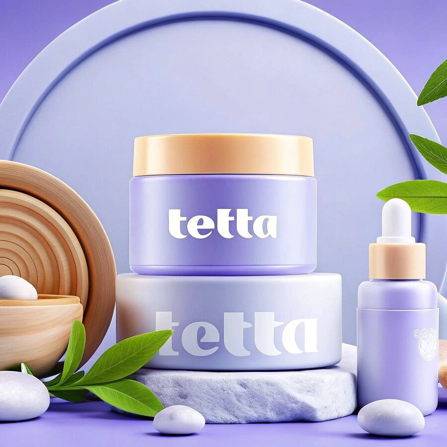 Prompt: Advertising poster for «Tetta» skincare. Vector graphic, flat design, showcasing a sense of natural serenity and comfort. Feature a Tetta product (e.g., a pump bottle or jar) as the hero item, surrounded by soft pastel purple and lavender elements. Include natural accents like smooth, light-colored pebbles, a gentle green leaf, and translucent, shimmering droplets. The white «Tetta» logo with the leaf symbol and «tetta» text should be prominently displayed. The overall mood should be calming, pure, and inviting, evoking a spa-like experience. Minimal text, focusing on visual appeal.