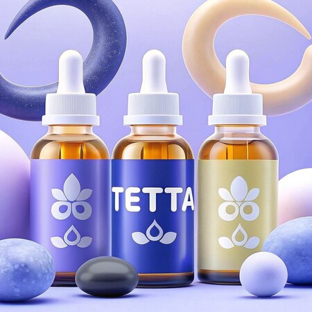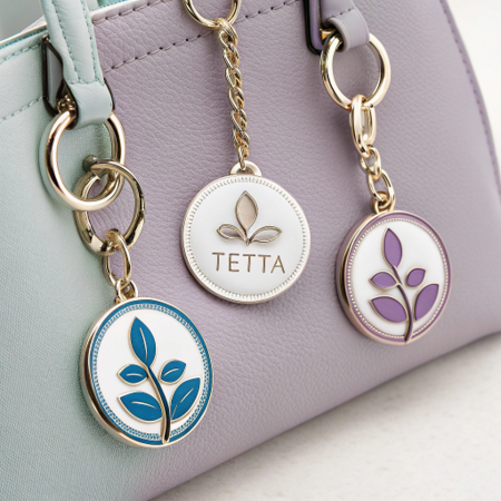 Prompt: product design visualization for «Tetta» bag charms or accessories. Vector art, flat and clean. Create a set of small, elegant charms: one shaped like the «Tetta» leaf logo, another as a smooth pastel purple pebble, and perhaps a small capsule representing an essential oil. These should be designed to be attached to a bag. The charms should have a subtle shine or texture. Accompanying elements can include a minimalist green leaf and a soft lavender background.