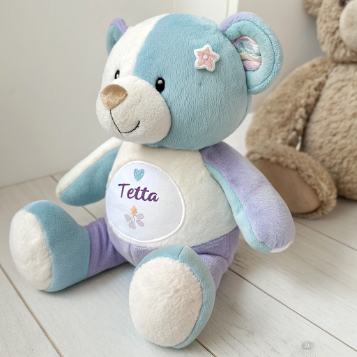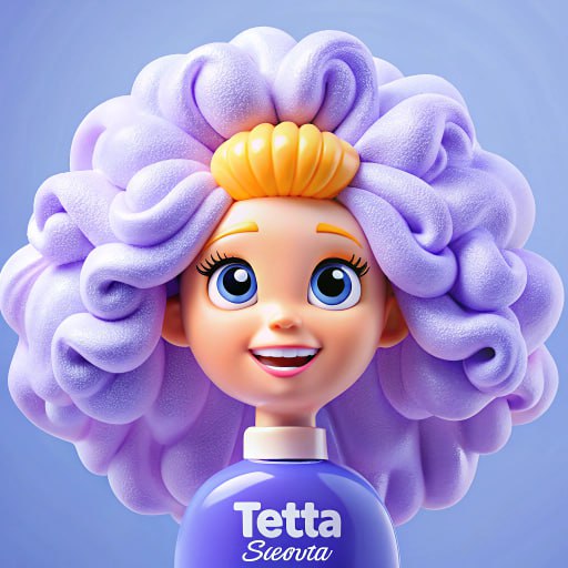 Prompt: plush mascot design for the «Tetta» brand. 3D rendering, cute and friendly style. The mascot is a round, soft creature, inspired by the shape of the leaf from the «Tetta» logo or combining leaf and drop elements. The main color of the mascot is pastel blue or purple (lavender). It should have large, kind eyes and a friendly smile. The texture should be soft, plush, and have visible stitching.