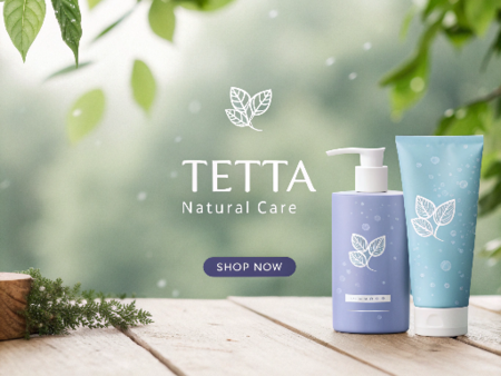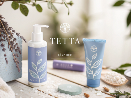 Prompt: website homepage design for «Tetta» skincare brand. Vector graphic, flat design style. The layout should be clean, modern, and minimalist, emphasizing naturalness and comfort. Feature the pastel purple and lavender color palette. Prominently display the white «Tetta» logo. Include sections for product showcases (e.g., a hero image of a Tetta product or a small collection), a brief brand story highlighting natural ingredients and eco-friendliness, and a call to action (e.g., «Shop Now»). Use high-quality imagery of Tetta products and subtle natural elements like leaves or pebbles. The overall design should feel serene and professional.