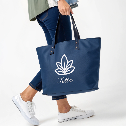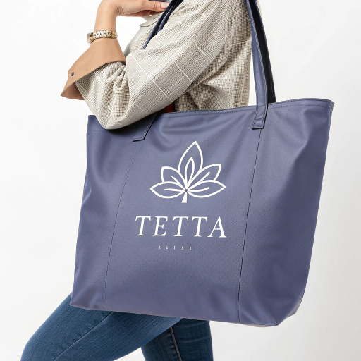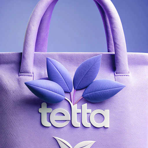 Prompt: product design visualization for a «Tetta» eco-friendly shopper bag. Vector illustration, flat design. The shopper bag should be a light, natural material (like canvas or recycled fabric) with pastel purple accents. The white «Tetta» logo should be prominently displayed on the front. A small detail like a pastel purple handle or a subtle leaf motif can be added. The overall design should be minimalist, functional, and eco-conscious.