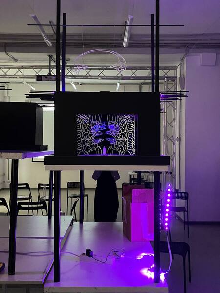 В рамках работы над сценографией к трагедии Эсхила «Орестея» были произвдены расчёты и сделаны габаритные чертежи, планировки, разрезы, техническая опись, 3D модель и чертёж.