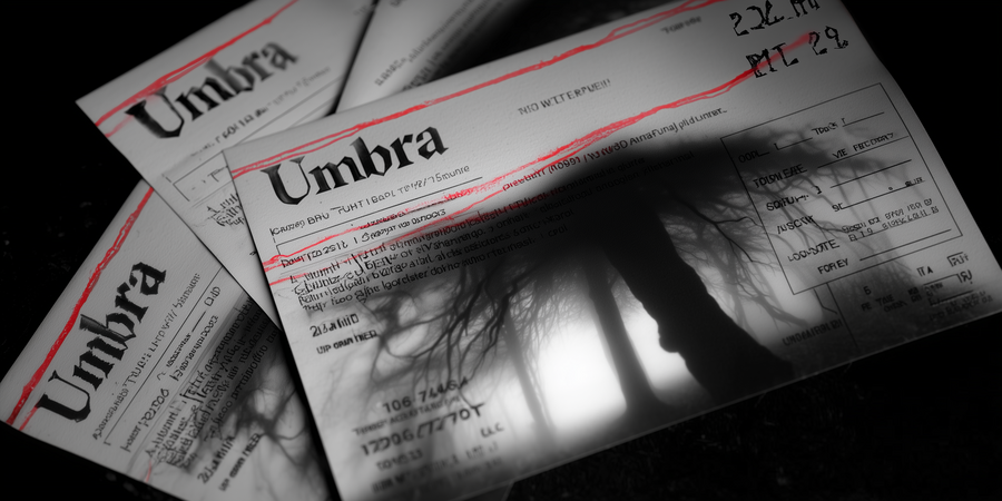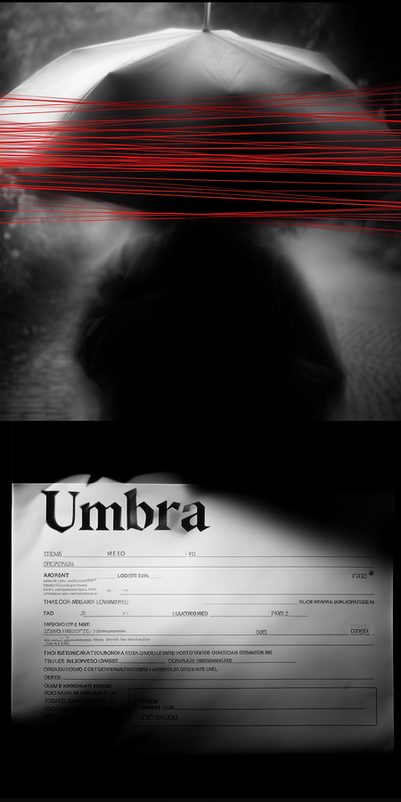 vertical advertising poster with a dark atmosphere with the Umbra logo, text and red lines to the poster.